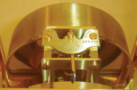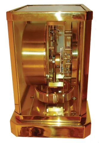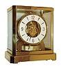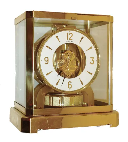 Jaeger - LeCoultre, Switzerland, "Atmos" clock, 15 jewel gilt caliber 528 movement, gilt torsion pendulum, round white painted dial with applied gilt Arabic numerals and arrow markers, gilt hands with black painted tips, all contained in a glazed