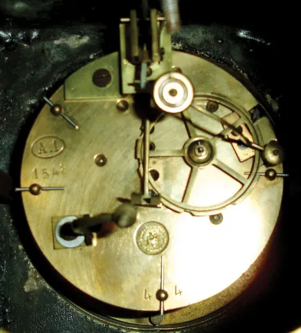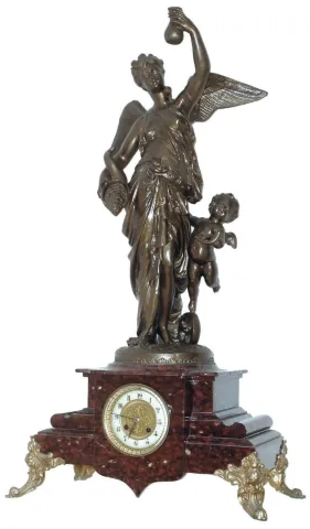 France, ornate figural mantel clock, shaped and molded griotte marble case resting on gilt scroll feet with foliate ornament, surmounted by a winged female figure with cornucopia overflowing with coins, and bag presumably also containing currency, a putto with horn at her left side, the composition representing the fruits of industry, gilt bezel with beveled glass, Arabic numeral white enamel dial with gilt ornamental center, blued steel hands, 8 days, time and strike, pendule a Paris movement, c 1900 Dark red marble with decent repair and now with a coat of lacquer, top marble with losses at left and right front corners, figure with restored patination, feet with gold paint, glass with minor scratches, dial with hairlines, movement ticks and strikes, bell replaced, rear mounting/retainer ring a bit small for the opening, will need attention. Although there are some cosmetic issues, the clock is in overall good condition and very impressive. Ht 31"