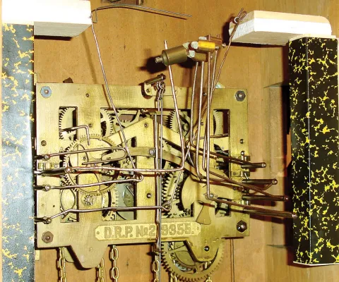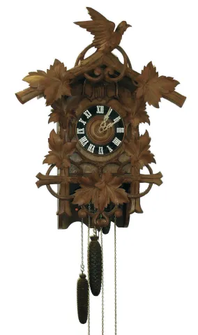 Germany, large quarter chiming cuckoo, the case with typical leaf carved front and roof trim with carved bird, case sides extended and with S curve cutout at bottom, Roman numeral wooden dial and carved bone hands, weight driven 3 train 30 hour brass