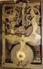 Germany, Black Forest shelf cuckoo, oak and oak veneered case with ebonized moldings, leaf carved roof trim, and applied carved ornament on case front, Roman numeral wooden dial with carved bone hands, brass 8 days, time and strike, movement, the time