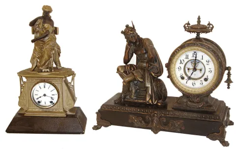 Seth Thomas repainted, ticks and strikes, Ansonia with losses to original finish, dirty, Mercury's helmet with broken wing, ticks and strikes...