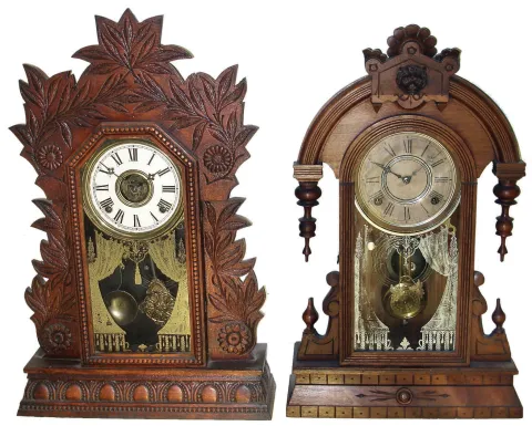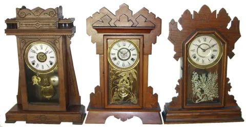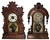 Clocks- 5 (Five) Conn., shelf: Gilbert "Laurel No. 3" oak with alarm; Gilbert "Atossa" walnut with alarm; New Haven No. 550 mahogany; Boyle Bros. for Gilbert walnut; unlabeled [probably Russell & Jones, Pittsfield, Mass.] oak with fancy pendulum; late