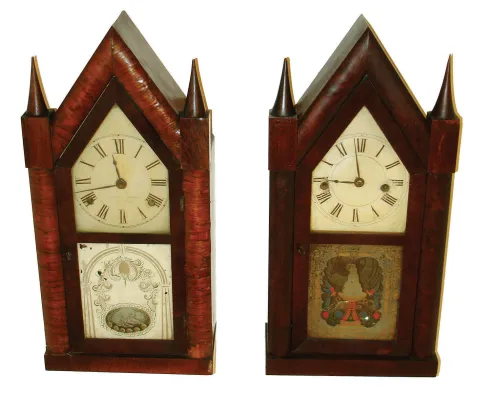 Clocks- 2 (Two) steeple clocks. (1)Terry & Andrews, Bristol, Conn., 30 hours, time and strike steeple clock. (2)Brewster & Ingrahams, Bristol, Conn., 30 hours, time and strike fusee movement steeple clock.