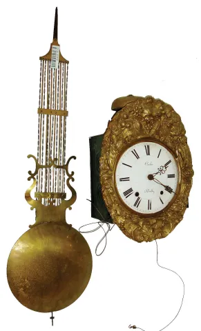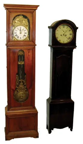 Clocks- 3 (Three): a Morbier tall clock in a cherry case; a English tall clock in a mahogany case and a Morbier dial, movement, pendulum and weights