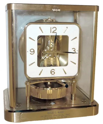 Jaeger - LeCoultre, Swiss "Atmos" 13-jewel glass and gold-plated brass perpetual mantel clock #634697 with 1988 presentation plate
