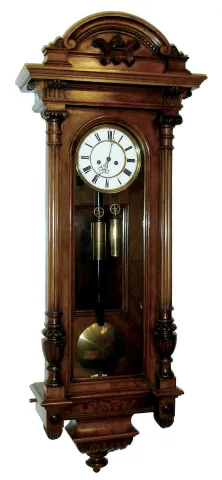 Vienna regulator, walnut and walnut veneer case with carved ornament, removable crest also with carving, door with turned and carved columns, Roman numeral white enamel dial with pierced blued steel hands, brass 8 days, time and strike, movement, 5 spoke
