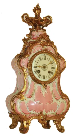 Lenzkirch, Germany, porcelain and brass 8 days, time and strike, mantel clock, c1890 the elegant unsigned case has no visible flaws, and its gilt cast-metal ornaments retain a good patina. The porcelain dial has tiny chips around the rate adjuster but otherwise is fine, as is the beveled glass. The signed and numbered movement is similar to round French models, and strikes on a coil gong. Ht 18"