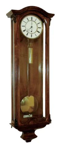 C. Suchy & Soehne, in Prague, Vienna regulator, walnut and walnut veneered case with with light wood trim around side glasses, and with string inlay in backboard, signed Roman numeral white enamel dial, pierced blued steel hands, signed brass 30 day