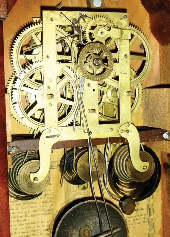 Chauncey Boardman, Bristol, Conn., 30 hours, time, strike & alarm triple fusee sharp gothic or steeple clock, c1850
