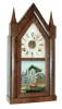 Chauncey Boardman, Bristol, Conn., 30 hours, time, strike & alarm triple fusee sharp gothic or steeple clock, c1850 Refinished mahogany veneered case with a small repair on base. Original painted dial has dark areas on the edges and paint loss at the mounting pins and on edges. "View of Italy tablet is a painted copy of original decalcomania glass. Hands are original. The finial tips have minor loss. Clean interior label with some stains. Ht 20"
