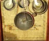 Refinished mahogany veneered case with a small repair on base. Original painted dial has dark areas on the edges and paint loss at the mounting pins and on edges. "View of Italy tablet is a painted copy of original decalcomania glass. Hands are original. The finial tips have minor loss. Clean interior label with some stains. Ht 20"