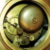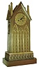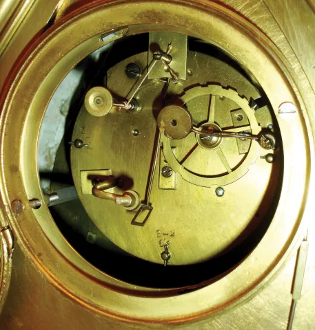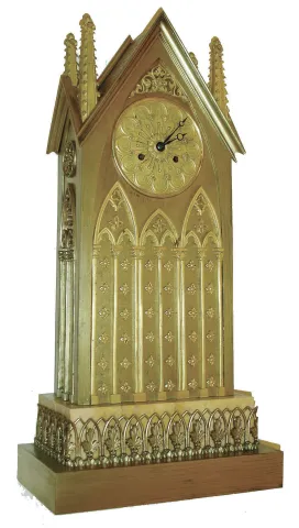 France, cathedral form mantel clock in the Gothic style, gilt bronze case with gabled facade, the 4 corners with crocket decorated pinnacles, the front and sides with ornamental lancet arches, atop a siena marble and gilt bronze base, the marble with lancet arch and foliate fence surround, Roman numeral gilt Gothic dial with blued steel Breguet style hands, 8 days, time and strike, pendule a Paris movement with silk thread suspension, c1840 Case dirty and with losses and abrasions to gilding, spotting, feet now absent, dial dirty, numerals require restoration, hands dirty, marble with chips at rear lower corners (not visible from front), fence with 2 splits, movement ticks and strikes. Several cathedral from clocks can be viewed in Tardy's. Ht 20 3/4"