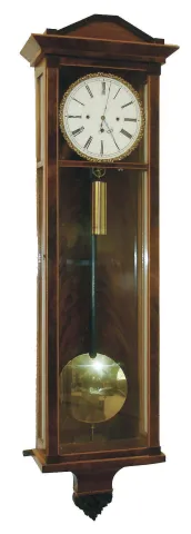 Austria, Vienna regulator, Biedermeier style, mahogany veneered case with light wood borders, backboard with nicely figured crotch mahogany veneer, top with ripple molding, and bottom bracket with carved composition ornament, Roman numeral white enamel dial with cast brass piecrust bezel, blued steel hands, brass 3 train grand sonnerie striking movement, the 3 days time train driven by a brass weight, the strike trains powered by springs, and probably of 2 to 3 day duration, c1850 case in an old finish, with some fading to veneers, and minor insect damage, bottom with replaced ornament, one stabilizing screw missing, side glasses loose, movement mounting brackets re glued and with residue on interior of case back, bezel good, dial with restoration to numerals, and a coat of lacquer, minor chipping to enamel at winding arbors, hands with bends and uneven bluing, movement with minor oxidation on steel parts, ticks and strikes, back edge of seat board trimmed, weight with minor loss to lacquer, pendulum with minor scratches, Ht 41 1/2"