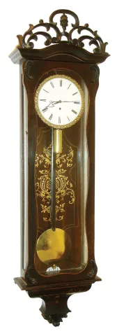 case with wear to finish, and minor losses to surface, carved crest with crack, composition ornament not original to clock, backing block for lower leaf ornament also replaced, gilt decoration on bottom bracket with loss, ornament inside case back good, bezel good, dial with minor scratches, hour hand replaced, movement ticks, pendulum polished and with coat of lacquer, weight with minor dents, Ht 43 1/2"