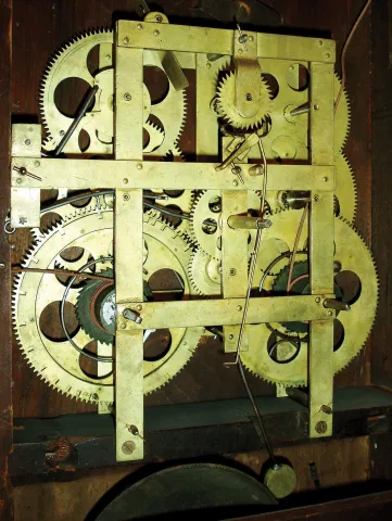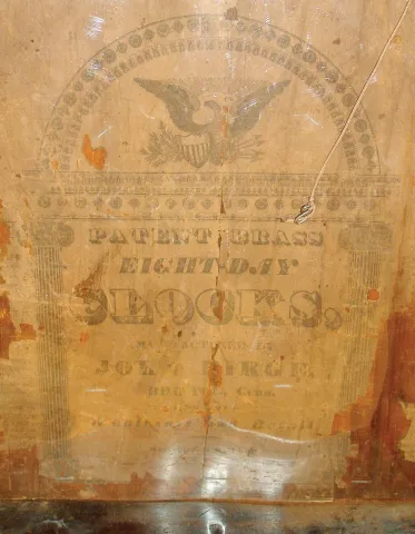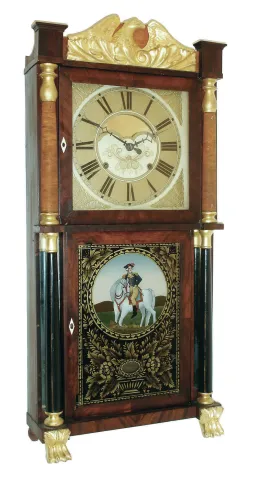 John Birge, Bristol, Conn., 8 days, time and strike, weight driven early strap brass movement double decker shelf clock, c1831 Refinished mahogany veneered case with a small piece of veneer missing on the lower left corner of the bottom door and some small damage on the bottom left corner of the upper door. Gilding, paint and graining on the columns, splat and feet have been restored. Tablet is a replacement. Original painted dial is very clean. Mirror behind the dial has been restored. Interesting use of mirrors behind the lower columns. Hands are original. Ht 38"