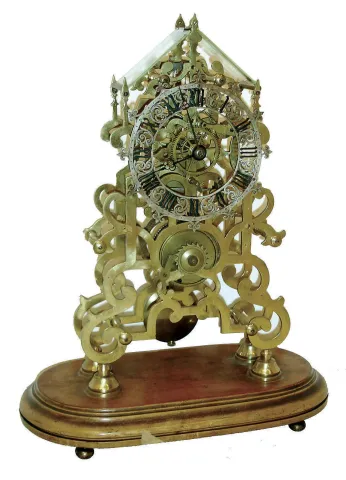 England, attributed to W. F. Evans, Handsworth, single fusee skeleton clock of excellent quality, with fine 5-spoke wheels in the train. also with pierced and engraved dial, on a light birch base, less dome, C.1875 the custom made base has no provision for a glass dome. A clock enthusiast, worried over dust in the movement, added 3 pillars near the top to support 2 panes of glass acting as dust covers over the escapement. Otherwise a well pierced frame with 6 turned pillars, all held with screws and collets. Original fusee chain intact. Dial with bends and a crack. Ht 17"