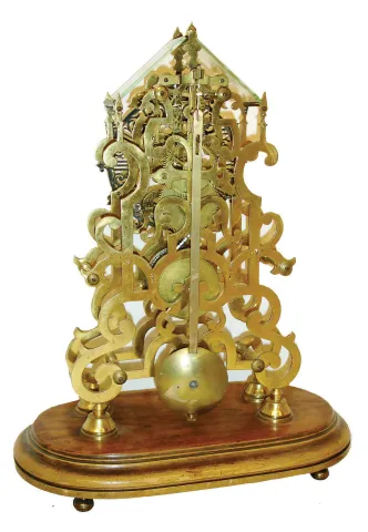 England, attributed to W. F. Evans, Handsworth, single fusee skeleton clock of excellent quality, with fine 5-spoke wheels in the train. also with pierced and engraved dial, on a light birch base, less dome, C.1875