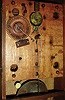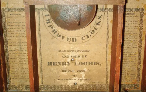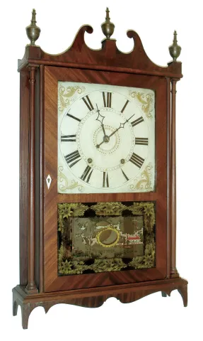 Henry Loomis, Bristol, Conn., 30 hours, time and strike, weight driven wood movement pillar & scroll shelf clock, c1830 Mahogany veneered case with a small piece of veneer missing on the skirt, a repair to the right scroll and a small piece missing on the right front foot. A small piece is missing on the top left chimney cap. Original hands. The wood painted dial is period and the style often found on Bristol clocks, but may be a replacement as there are a couple of extra holes for anchor pins. Original painted tablet with considerable loss. Clean label inside the case. Dust cover on the back of the case is missing. Finials are modern. Ht 29"