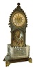 France, an unusual table clock with fountain, patinated bronze case in the Gothic taste, the base containing a cut a cut glass reservoir, the front corners with gryphon feet, case front with niche, trimmed with cast foliate ornament and grotesque mask, a