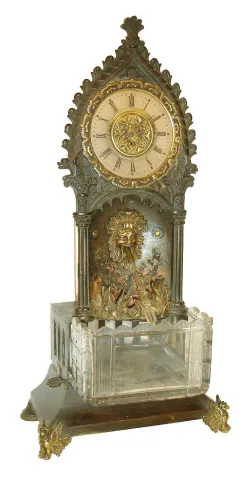 France, an unusual table clock with fountain, patinated bronze case in the Gothic taste, the base containing a cut a cut glass reservoir, the front corners with gryphon feet, case front with niche, trimmed with cast foliate ornament and grotesque mask, a twisted glass rod which rotates under power of a concealed movement simulates water pouring from the mouth of the mask, frosted glass dial with painted Roman numerals, 30 hour Swiss verge movement, c1850 case very dirty, appears to retain some of the original surface, base of niche with rust, foliate ornament and mask loose, glass rod broken and with repair, pinion driving the rod badly rusted, and requires replacement, glass reservoir with a few flakes, dial with touch ups and glued into bezel, minute hand missing, both movements running, fountain movement needs service, and now with a plastic thermostat cover protecting it from dust, Ht 16"