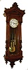Clocks- 2 (Two): (1) F. Primoda, in Wien, Vienna regulator, walnut and walnut veneered case, split turned columns with carved capitals and bases, deeply curved veneered bottom bracket with inlay, removable carved crest above a molded cornice, signed Roman