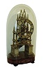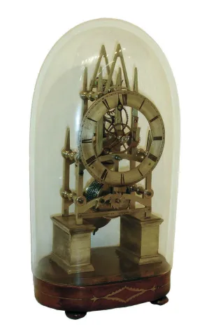 English made single chain fusee skeleton timepiece in a sharp Gothic frame with 6 heavily turned baluster pillars, and a solid silvered chapter ring and pierced lancet hands, c1840. Silvered engraved brass cross piece indicating it was retailed by Griffiths of London. silvering on the dial and plinths has discolored and is worn. Old dome is a nice older replacement, but is a bit wide, thus extends off the sides of the base. Overall a good original skeleton clock. Ht of plinth and frame = 13" Overall ht including base and dome = 17"