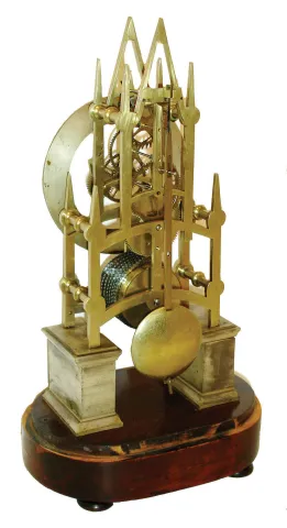 English made single chain fusee skeleton timepiece in a sharp Gothic frame with 6 heavily turned baluster pillars, and a solid silvered chapter ring and pierced lancet hands, c1840. Silvered engraved brass cross piece indicating it was retailed by