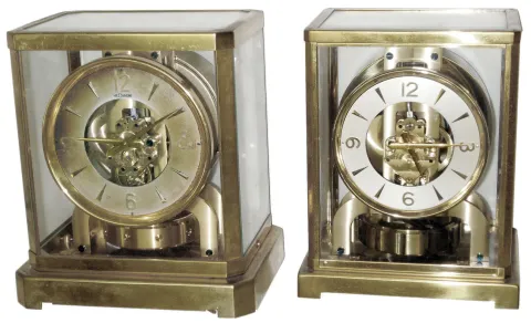 Clocks- 2 (Two) Atmos LeCoultre Swiss perpetual mantel clocks: #89856 Caliber 522, c1955, with original box; #44751Caliber 519, c1948