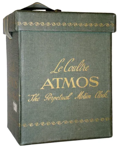 Clocks- 2 (Two) Atmos LeCoultre Swiss perpetual mantel clocks: #89856 Caliber 522, c1955, with original box; #44751Caliber 519, c1948 both of these high-quality jeweled timekeepers, powered by temperature and barometric pressure changes, are complete and intact. The gold-plated surfaces are tarnished, and the dial on the larger one has darkened. The green fabric-covered box is in good condition. The disk pendulums rotate but the movements were not tested long term Hts 8 3/4" and 9 1/4"