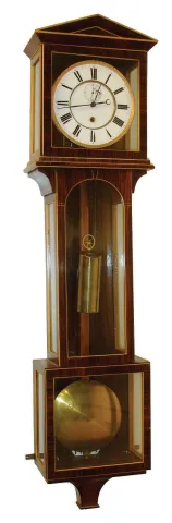 Reproduction "Laterndluhr", bench made Brazilian rosewood veneered case with light wood borders, Roman numeral white enamel dial, blued steel hands, brass 8 day timepiece movement, polished brass pendulum and weight, late 20th century