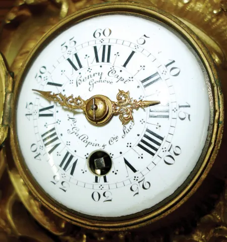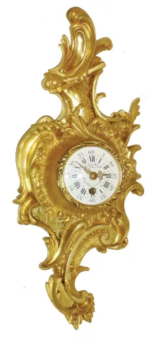 French miniature cartel gilt-bronze 8 day timepiece, dial signed "Henry Capt, Geneve", c1900 this ornate cast metal case is in very nice condition, as is the detailed white porcelain dial, convex glass and ornate hands. The small round movement, with its jeweled lever platform and visible winding stopworks, ticks briskly. Ht 12"