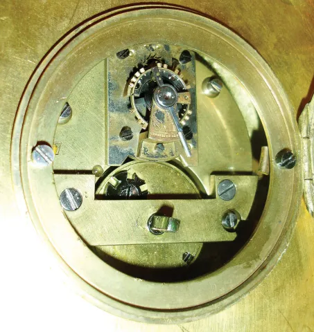 this ornate cast metal case is in very nice condition, as is the detailed white porcelain dial, convex glass and ornate hands. The small round movement, with its jeweled lever platform and visible winding stopworks, ticks briskly. Ht 12"