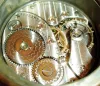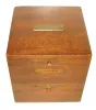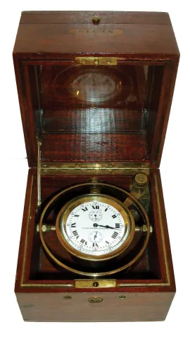 Elgin Watch Co., Elgin, Illinois. Deck watch, 18 size grade 412, 212 jewel damascened nickel movement with wind indicator, lever escapement with free sprung bimetallic balance, Roman numeral white enamel dial and blued steel hands, contained in a gimbaled brass weighted case, and housed in a chronometer style mahogany box, the top with engraved brass plaque "U.S.S.B. Ship Watch No. 1063" (United States Shipping Board), c1915 CASE: Box good, finish with crazing, minor dirt and scratches; Gimbal and bowl with scratches, losses to lacquer and minor tarnish; Bezel glass with minor scratches. DIAL: Hairline in enamel, light, 5:00; Chip in enamel, 8:30. HANDS: Very good. MOVEMENT PLATES: Minor scratches on plate; Dirty, oily; Spots of rust on crown wheel screw. MOVEMENT FUNCTION: Not running, good staff, starts with pressure on center wheel, needs service, box 5 1/8" x 5 1/8" x 5 1/4". There are very few other examples of this grade with wind indicator in a gimbaled box known.