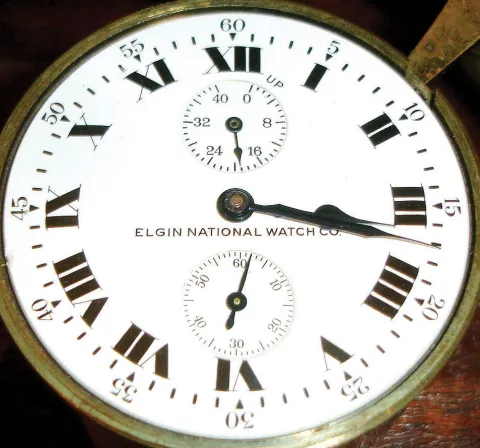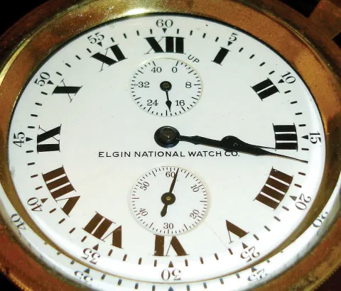 Elgin Watch Co., Elgin, Illinois. Deck watch, 18 size grade 412, 212 jewel damascened nickel movement with wind indicator, lever escapement with free sprung bimetallic balance, Roman numeral white enamel dial and blued steel hands, contained in a