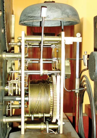 the clock is in excellent original condition with tarnish on the silvered dial. The clock is signed by Evans on both the dial and the movement and there is a great Paine furniture label on the rear of the case. Ht 101"