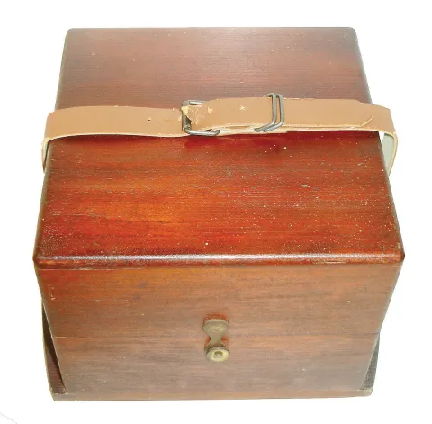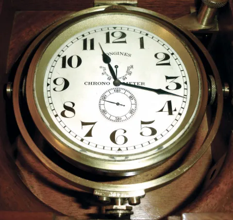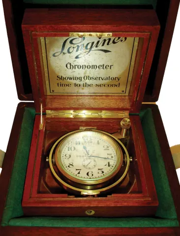 Longines, Switzerland, lever escapement chronometer with boxes, outer mahogany protective case containing the brass mounted, gimbaled box, the lid with plaque stating "Longines Chronometer Showing Observatory Time to the second", timepiece mounted in a