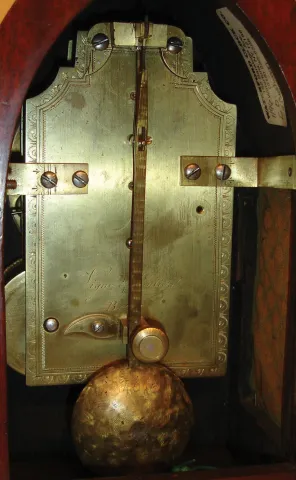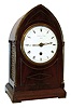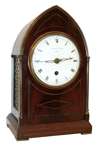 Vigne & Lautier, Bath, England, small bracket clock, lance arch mahogany and mahogany veneer case, with inlaid brass moldings, brass columns and trim, and thin brass feet, the sides with fabric lined pierced brass frets, the back with glazed door, Roman numeral white enamel convex dial, pierced arrow hands, signed brass 8 day fusee timepiece, the shouldered back plate with engraved border, c1835 case with minor splits, minor veneer blisters, 2 pieces of brass molding missing, dial with hairlines and filled chip at 9:30, minor loss to signature, hands good, running, Ht 10 1/2"