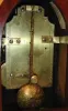 Vigne & Lautier, Bath, England, small bracket clock, lance arch mahogany and mahogany veneer case, with inlaid brass moldings, brass columns and trim, and thin brass feet, the sides with fabric lined pierced brass frets, the back with glazed door, Roman