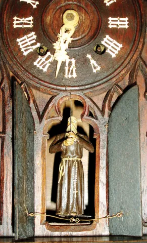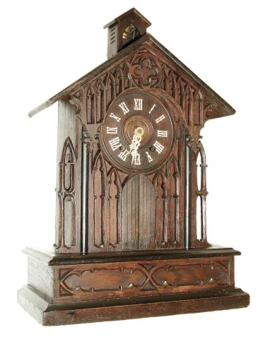 Germany, black forest clock with bell ringer, oak and oak veneer cathedral form case with ebonized moldings and pierced Gothic style ornament, the doors below the dial opening at the hour and half hour, revealing a monk who pulls a rope and appears to