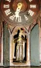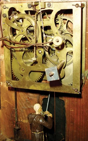 Front edge of left side of roof broken and repaired, belfry replaced, apertures in case sides now with glass panels, dial with split, carved monk very...