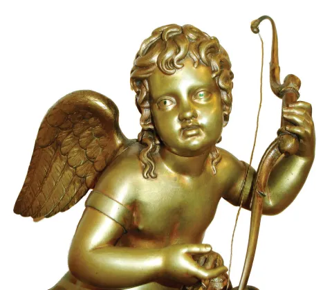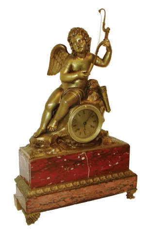 France, first half 19th century, bronze figural clock, depicting a young winged archer, and with a good silk thread pendule a Paris movement, silvered engine turned brass dial, Breguet style moon hands, c1830 some minor roughness at corners of red mottled marble; a couple bright spots on bronze from handling without gloves; well made pendule a Paris movement, lacks bell and retainer nut. Dial silvering has tarnished a bit. A quality heavy bronze, nicely chased with good detail. A heavy clock. Ht to cherub's head 20 1/2", ht to tip of bow, 23" width 14"