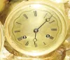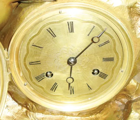 some minor roughness at corners of red mottled marble; a couple bright spots on bronze from handling without gloves; well made pendule a Paris movement, lacks bell and retainer nut. Dial silvering has tarnished a bit. A quality heavy bronze, nicely chased with good detail. A heavy clock. Ht to cherub's head 20 1/2", ht to tip of bow, 23" width 14"
