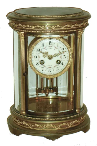 French, for Shreve Crump & Low, Boston, oval 8 days, time and strike, crystal regulator, 1855 Vincenti Medaille D'Argent movement, c1880 the fancy oval case has fluted columns and applied cast brass flourishes. The curved glasses are fine. The multicolor signed porcelain dial, with floral garlands, is pristine. Original hands. The compensating pendulum has intact glass vials. The movement, with Brocot escapement, ticks and strikes. Ht 10 1/4"