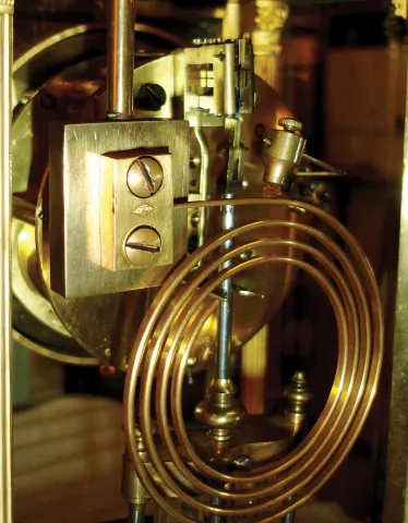 the fancy oval case has fluted columns and applied cast brass flourishes. The curved glasses are fine. The multicolor signed porcelain dial, with floral garlands, is pristine. Original hands. The compensating pendulum has intact glass vials. The movement, with Brocot escapement, ticks and strikes. Ht 10 1/4"