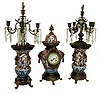 France, 3-piece mantel garniture clock set, red, white and blue porcelain, with bronze trim and glass prisms, Vincenti striking movement contained within the largeset urn. C.1890