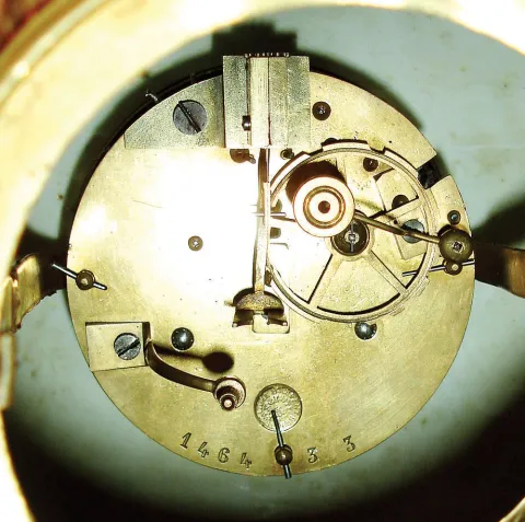 this is a large and very decorative set, and is in excellent original condition, with no apparent chips or damage to porcelain, and missing only one out of 40 cut glass prisms. Pendulum is wrapped inside case, however bell and nut are lacking (replacements are available from Timesavers in AZ) Ht of clock 18"; ht of side piece 25"