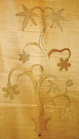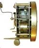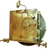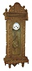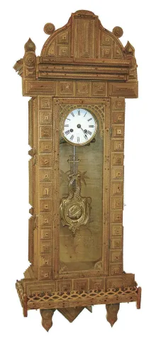 Tramp art clock case with spring Vienna movement, the case composed of chip carved and pierced graduated blocks stacked to create a very busy 3 dimensional effect, backboard with inlaid vine with flowers, case sides with decorative frosted glass panels,