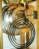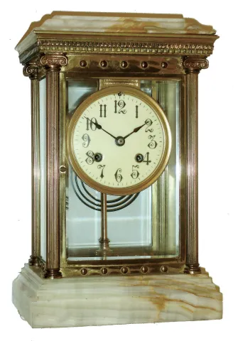 Vermont Clock Co., Fairhaven, VT, onyx, brass and beveled glass 8 days, time and strike, balance-wheel crystal regulator, c1900 the combination of rare maker and marble top and base make this a very collectible clock. No longer tandem-wind, this Eastman design retains its balance wheel which is now mounted and visible on the rear, rather than on the front as in preceding Boston movements. The fancy brass case is complete and undamaged, but tarnished, and the beveled glasses and porcelain dial are fine. The signed movement ticks and strikes. Ht 12"