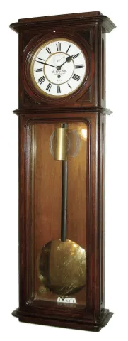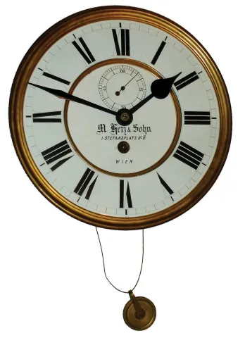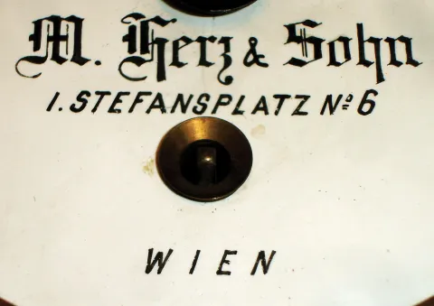 M. Herz & Sohn, 1 Stefansplatz No. 6, Vienna, Austria, oversize Vienna Regulator, 30 days, time only, brass weight driven movement with 10 1/2" pendulum bob in a walnut case with white enamel two part dial, c1900 the case retains its old original surface and the finish is wearing. The rear lower right return molding has a glue repair. There is a very light hairline in the second's bit. Ht 53"