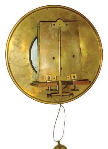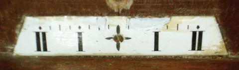the case retains its old original surface and the finish is wearing. The rear lower right return molding has a glue repair. There is a very light hairline in the second's bit. Ht 53"